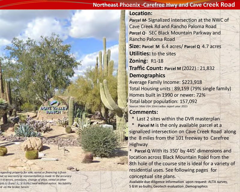 Listing details for 0 Cave Creek Rd #-, Phoenix, AZ 85098 : Last 2 sites within the DVR masterplan * Parcel M is the only available parcel at a signalized intersection on Cave Creek Road along the 8 miles from the 101 freeway to Carefree Highway Parcel Q With its 350' by 445' dimensions and location across Black Mountain Road from the 8th hole of the course site is ideal for a variety of residential uses. See following pages for conceptual site plans.