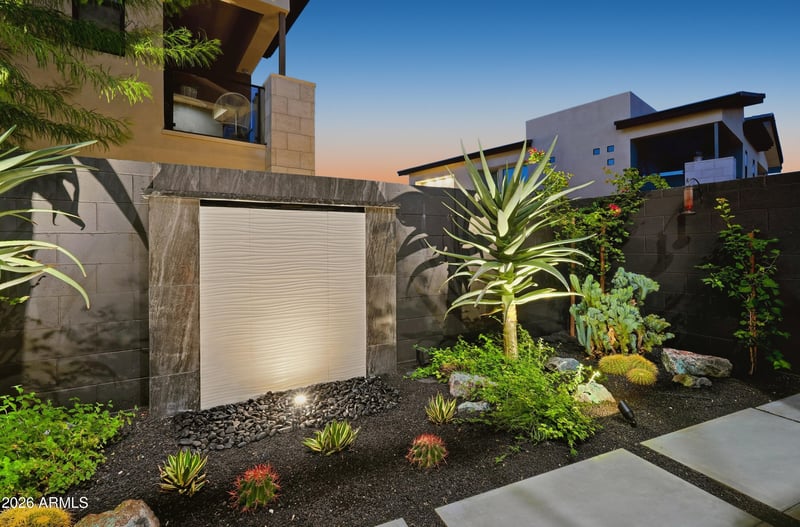 Seamless indoor/outdoor living is enhanced by a retractable glass wall that opens to a professionally designed Zen garden complete with a custom water feature, premium cacti landscaping, and ambient lighting that transforms the space into a serene desert oasis.