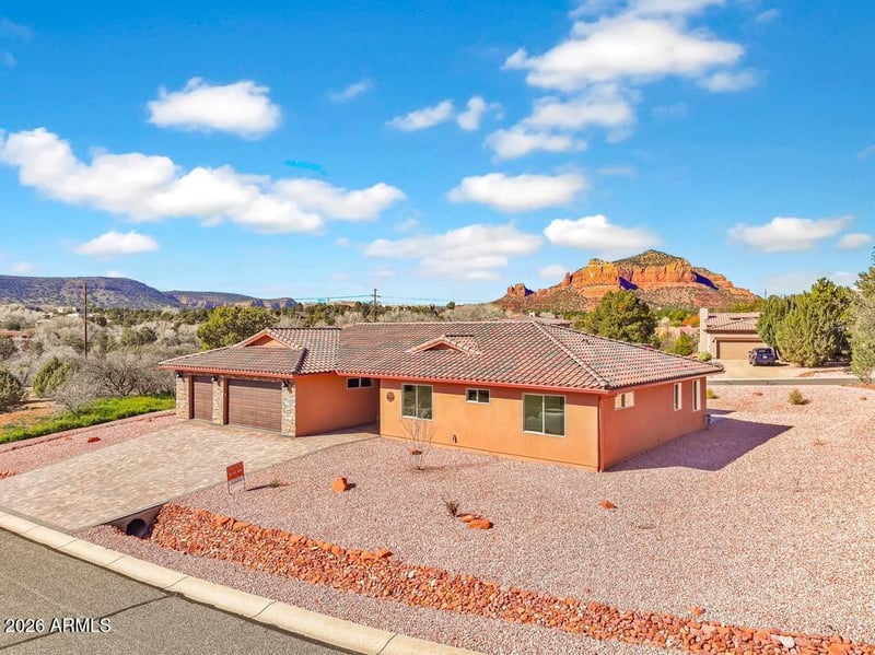 Listing details for 100 Las Ramblas --, Sedona, AZ 86351 : Brand NEW home in Las Piedras. This home is fantastic in every aspect. Beautiful open kitchen with upgraded knotty alder cabinets with slow pulls, oversized island for entertaining. Stunning granite counter tops thru out the home. Knotty alder doors thru-out. Energy star appliances. Custom bathrooms with upgraded fixtures. Sit and soak in the master tub and enjoy the peace that surrounds this home. Huge master bedroom and walk in closet with a built-in custom laundry hamper that goes right to the laundry room. Oversized great room with views galore. Enjoy the coziness of the fireplace. Copper light fixtures to enhance works of art or paintings. Split floor plan. Every room is enhanced by plenty of light and views. Oil rubbed bronze fixtures thru out the home. Extra insulation. Views are incredible, Bell Rock, Lee Mountain, sit on the enormous back patio and enjoy the peace and the scenery. Custom pavers and tongue in groove ceilings enhance both the front and back patio. 3 car garage and a 40' wide driveway beautifully done with pavers. Plenty of room for additional vehicle or RV. Landscaped all around the home with a drip system for the plants. Must see this home. 2-year builder warranty.