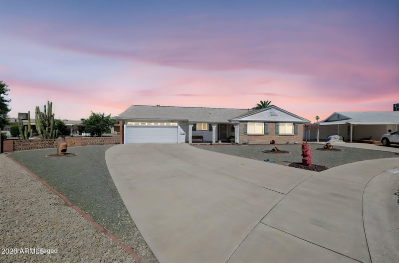 Listing details for 10032 Tarrytown Ave, Sun City, AZ 85351 : Discover your desert retreat, a 1,700 sq ft ranch-style home in the heart of the popular Sun City community. Built in 1965, this residence sits on a sprawling quarter-acre lot, offering outdoor privacy in this premier 55+ community. The layout features 3 bedrooms and 2 bathrooms providing ample space. Upgrades include vinyl dual pane windows throughout and tile and laminate floors. The home includes a double car attached garage with attached golf cart parking and workshop. This home is move in ready and turnkey with most furniture and furnishings to be included.