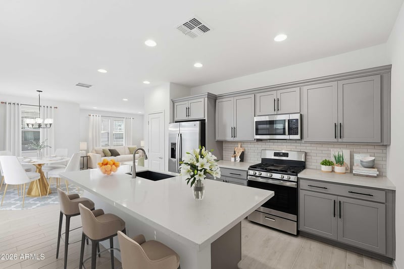 Listing details for 10048 Piccadilly Rd, Avondale, AZ 85392 : What's Special: Close to Park | Close to Amenities | East Facing Lot. New Construction - Ready Now! Built by America's Most Trusted Homebuilder. Welcome to the CC-RM2 at 10048 W Piccadilly Road in Parkside Villas! This is a gorgeous two-story floor plan that offers 1,639 sq. ft., three bedrooms, two and a half bathrooms, and a two-car garage. The charming front porch wraps around the foyer, creating beautiful curb appeal. Inside, you'll find an open-concept layout that seamlessly connects the great room, dining area, and kitchen. Conveniently located between the main-level powder room and the stairs, the garage entrance makes coming and going a breeze. Virtually staged photos are for representative purposes only. MLS#6949659 Upstairs, two bedrooms share a full bathroom with double vanity sinks, while the laundry room is thoughtfully placed near all the bedrooms to save time and energy. The primary suite features an en-suite bathroom with double vanity sinks, a split shower and tub, and a spacious walk-in closet. Step outside and enjoy leisurely walks or bike rides along the lush greenbelt, or meet friends for a game of basketball or pickleball on the community courts. The neighborhood also offers a sparkling pool and a playground, perfect for children to laugh and play. Connect with nature at the community's National Wildlife Federation-Certified Butterfly Garden. Watch vibrant orange and black wings flutter against the blue sky as monarch butterflies find sanctuary among native milkweed and colorful blooms. Additional Highlights Include: Marble super shower at primary bath and whole house blinds.