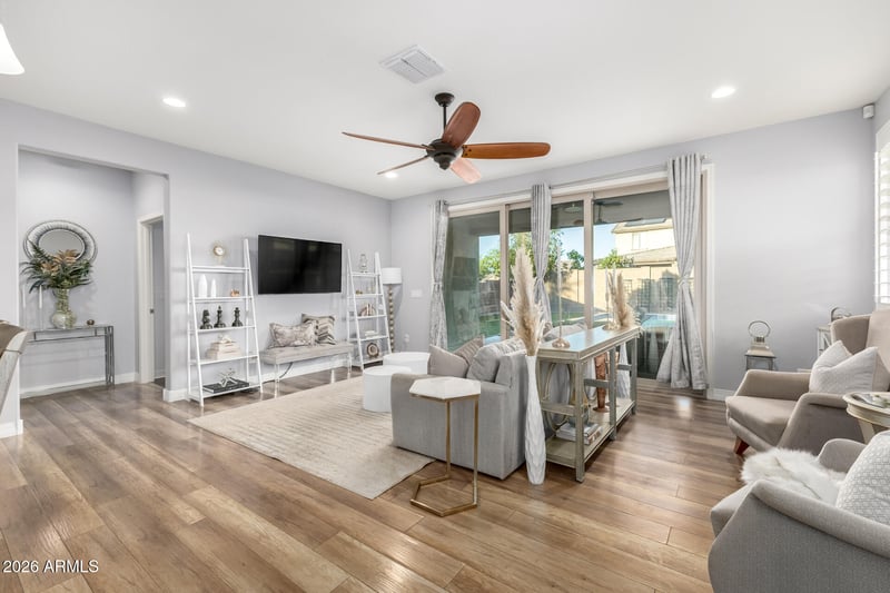 Listing details for 10052 Foothill Dr, Peoria, AZ 85383 : Welcome to this beautifully designed 3 bed, 2 bath home in the sought-after Meadows of Peoria, perfectly situated on a private cul-de-sac lot with no neighbor on one side and adjacent to a greenbelt and walking path. The split floor plan features two bedrooms and a full bath up front, opening into a bright great room ideal for entertaining. The modern kitchen offers white cabinets, quartz countertops, and an oversized island, plus a large laundry room with ample storage. The spacious primary suite includes dual vanities and a walk-in shower. Enjoy a backyard oasis with travertine decking, pool, and turf. Includes paid off owned solar! Community center features pool, spa, parks, and pickleball courts. This is one you won't want to miss!