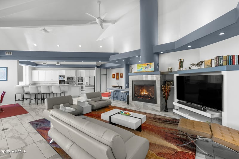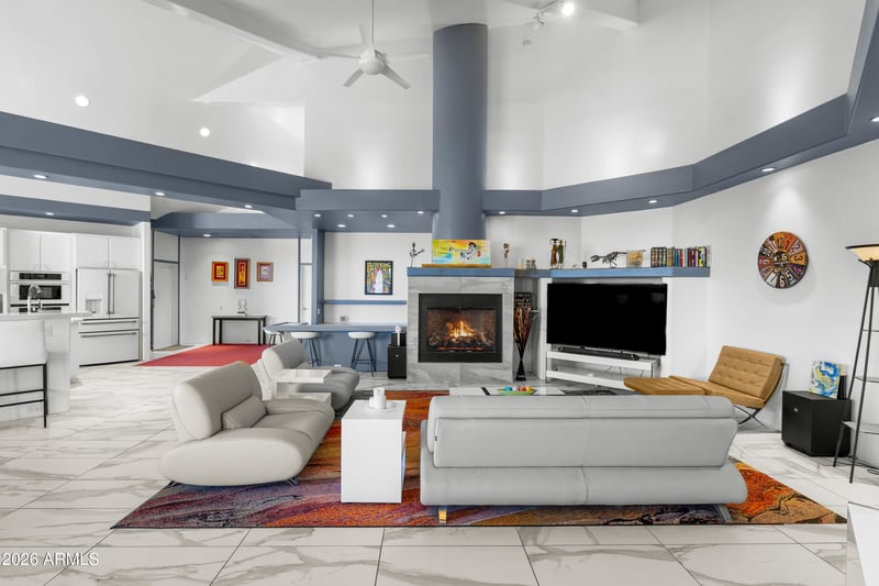Listing details for 10076 Roan Rd, Flagstaff, AZ 86004 : 10076 Roan Road is a truly special single-level home with stunning mountain views, blending unique contemporary design with the beauty and freedom of rural living. It's fabulous! Located in Cosnino Equestrian, a small community with shared equestrian facilities, it is a wonderful setting for horse owners and for anyone who values peace, space, and the quiet beauty of Flagstaff's countryside. The home is designed for true open-concept living. The spacious great room with 23-foot vaulted ceilings and a fireplace, the large upgraded kitchen, the dining area, and the entertainment bar each have their own identity, yet all connect beautifully in one expansive living space. It is inviting and interesting for family, and is an entertainer's dream! The primary suite feels especially spacious and airy with high vaulted ceilings and windows, while the sunroom just off the side of the home, with its own separate entrance, is the perfect, private second living area, media room, or office.