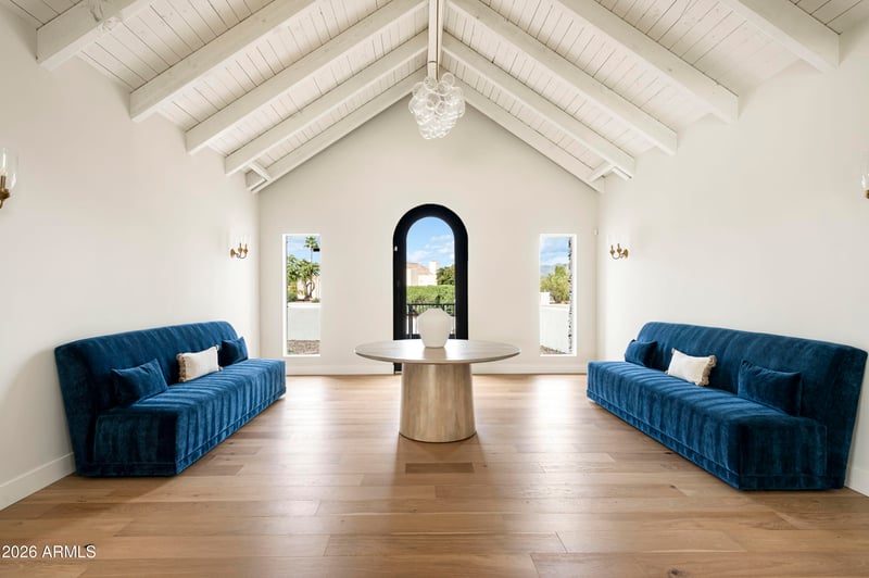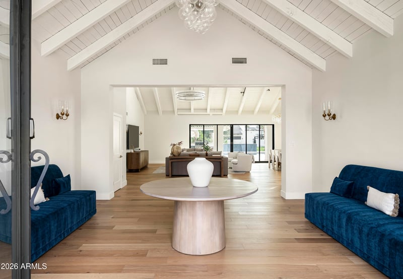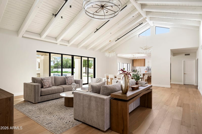 Listing details for 10111 Cholla St, Scottsdale, AZ 85260 : Fully renovated residence with 7-car garage in Scottsdale's coveted Cactus Corridor. This reimagined property blends modern sophistication with timeless design, showcasing McDowell Mountain views, a grand entry, soaring ceilings, and expansive windows that flood the home with natural light. The open-concept great room features a statement fireplace and seamless indoor-outdoor living. A chef's kitchen impresses with waterfall quartz countertops, custom cabinetry, and premium Café appliances. The split floor plan offers private guest quarters and an oversized entertainment room. The oversized lot has a refinished pool and sport court with plenty of room to add. Over-height garage with workshop is a rare opportunity.
