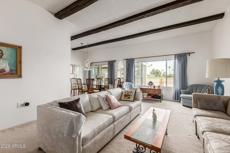 Listing details for 10126 Brookside Dr, Sun City, AZ 85351 : Home, sweet home! This charming 3-bedroom residence backing to the golf course welcomes you with a 2-car garage and a front patio that sets an inviting tone. Fall in love with the spacious living room boasting high ceilings, exposed beams, a soothing palette, and soft carpeting underfoot. The eat-in kitchen comes with ample wood cabinetry and built-in appliances for a seamless cooking experience. You'll also find a bright sunroom, perfect for enjoying the warm Arizona weather. The cozy primary bedroom includes a make-up vanity, a private bathroom, and a convenient walk-in closet. Unwind on the sizeable screened patio, ideal for reading a good book or sipping on your favorite drink. The lovely backyard offers an open patio and tranquil golf course views. Make this turn-key gem yours now!