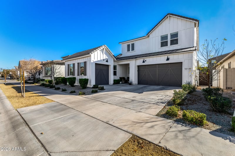Listing details for 10133 Toledo Ave, Mesa, AZ 85212 : Located on a quiet interior north/south lot in Cadence at Eastmark, this spacious 6-bedroom, 4.5-bath Mesa home offers a highly desirable layout with primary suite downstairs, plus a guest bedroom and full bath on the main level—ideal for multi-generational living, guests, or home office needs. A large loft adds flexible living space for a media room, play area, or second family room. Interior features include 10-12 ft ceilings, plantation shutters, and luxury vinyl plank flooring throughout the main living areas. The open gourmet kitchen is built for entertaining with a huge island/breakfast bar, walk-in pantry, quartz countertops, 42'' soft-close cabinets, and stainless-steel appliances, including double ovens, gas cooktop, & built-in microwave. The spacious downstairs primary suite... includes an en-suite bath with quartz counters and a walk-in shower. Outdoor living is enhanced by an extended covered patio, additional concrete entertaining space, and a large landscaped backyard with synthetic grass perfect for low-maintenance living. Additional features include a 3-car garage and walking distance to parks.