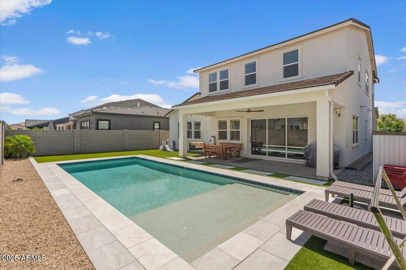 Get ready for your own private slice of paradise in this backyard. This amazingly upgraded concrete PebbleTec pool features an oversized Baja step - perfect for splashing with the littles or just soaking up the sun in style. You'll also love the low-maintenance turf - more time for fun, less yard work! With the backyard swing, your oversized patio, and outdoor surround sound, you've got year-round enjoyment and charm.
