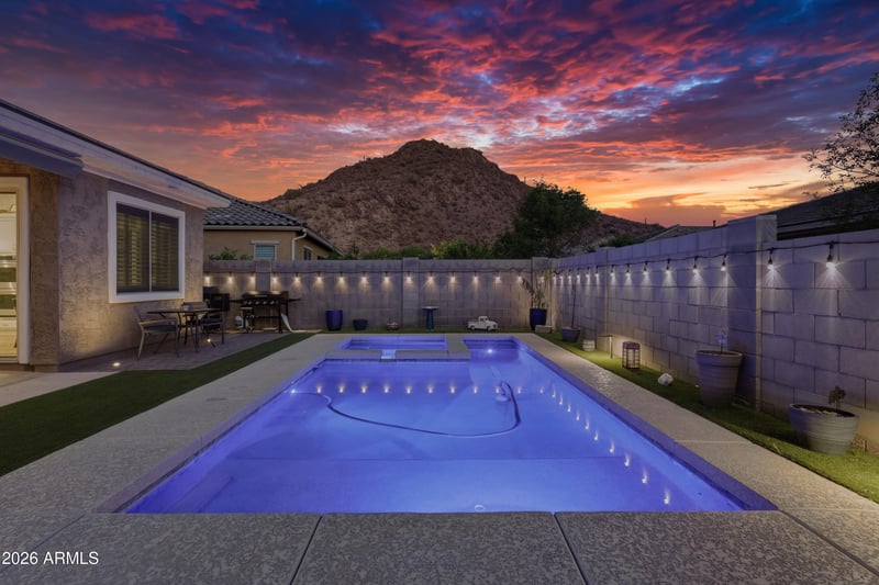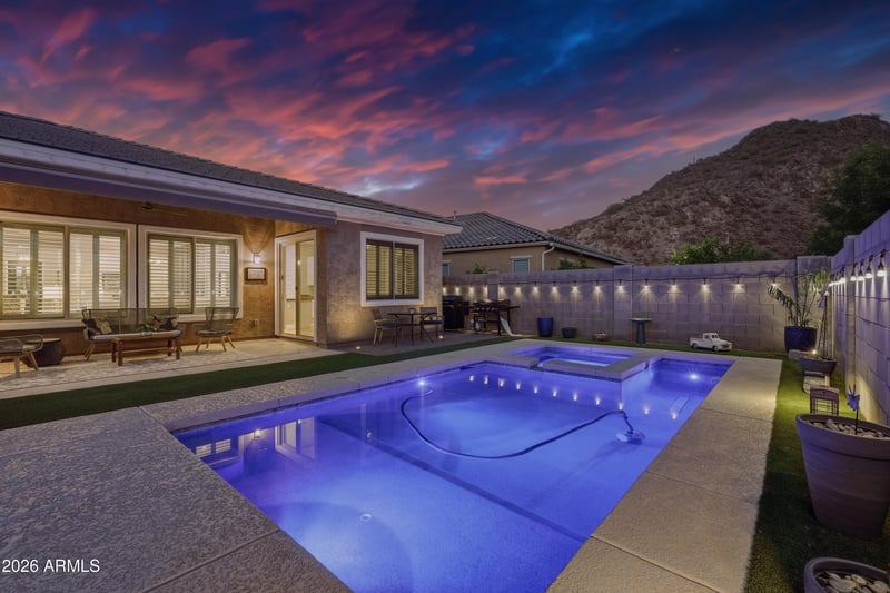 Outside, you'll enjoy every moment with a sparkling pool and hot tub, a covered patio with mechanical sun shade, a 12 x 12 pergola with a seating area, and the Calderwood Butte glowing in the background. Front and back yard landscaping has been updated with new turf, plants, trees, irrigation, and landscape lighting.