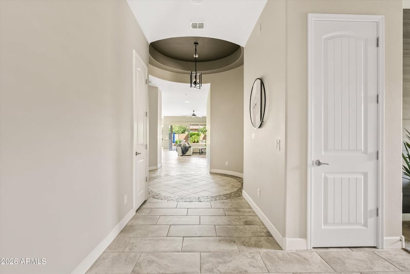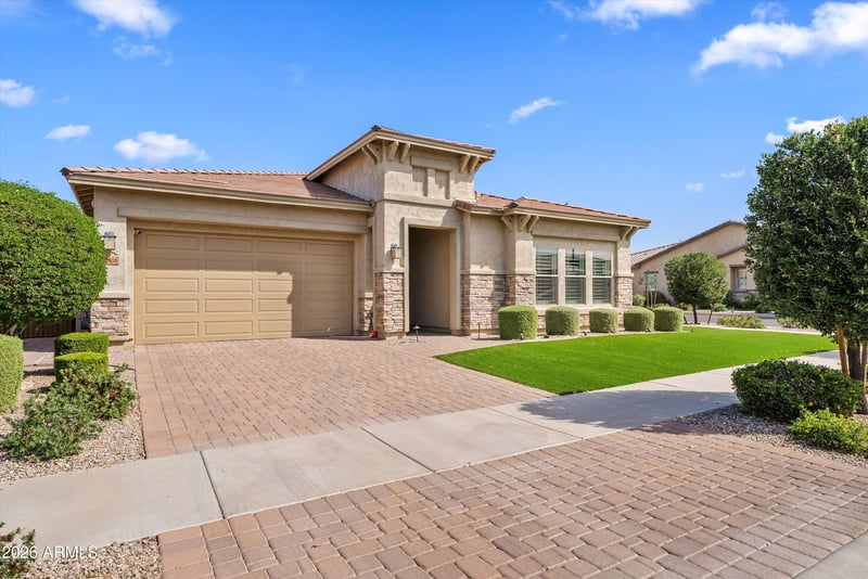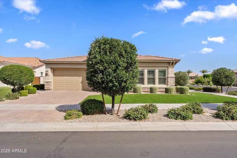 Listing details for 10310 Gamma Ave, Mesa, AZ 85212 : Located in the gated David Weekley section of Eastmark, this private corner lot home with no rear neighbors offers upgraded living with a bright open layout, tall ceilings, abundant windows, tile in main areas, and wood shutters throughout. The chef's kitchen features a large island, built-in oven, gas range, and seamless flow for entertaining. The spacious primary suite includes a soaking tub, oversized walk-in shower, dual sinks, and dual closets. Generously sized bedrooms throughout. The backyard is a showstopper with a pool, putting green, travertine pavers, built-in grill, and pergola. Enjoy top-tier Eastmark amenities, parks, and community living.