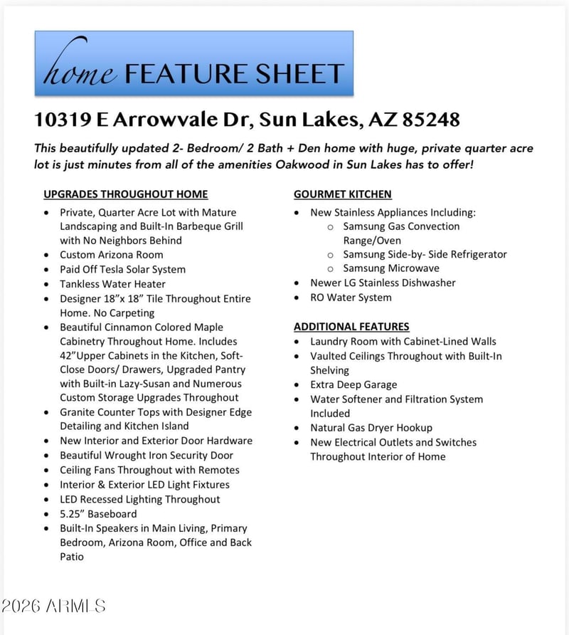 Listing details for 10319 Arrowvale Dr, Sun Lakes, AZ 85248 : Don't miss this tastefully updated 2 bed + DEN, 2 bath home in the gated Oakwood community of Sun Lakes with full amenities including golf, tennis, pickleball, pools, fitness center, clubs, social activities, restaurants & more! This home offers a refined blend of modern upgrades and warm, inviting finishes throughout. Step inside to find custom kitchen and bath cabinetry, designer granite, updated appliances, LED lighting, upgraded switches and outlets, and neutral tile throughout—no carpet anywhere. Enjoy the expansive professionally built Arizona room, custom laundry cabinetry, tankless water heater, PAID-OFF Tesla solar, built-in speakers, mature landscaping, and a very private quarter-acre lot with no neighbors behind. This home will not last!