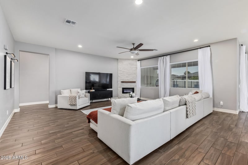 Listing details for 10326 Bergeron Ave, Mesa, AZ 85212 : Welcome to Eastmark, one of Arizona's most vibrant master-planned communities. Inside this home you'll see a spacious floorplan unfolds, a bright open kitchen with staggered cabinetry, quartz countertops, and classic subway tile. The space is perfectly suited for both daily meals and weekend entertaining. Beyond the main living area, a versatile den provides a dedicated spot for a home office or homework station, while the primary suite offers a quiet retreat with its own private door leading directly to the backyard. The outdoor space is a standout feature.This expansive backyard is designed for year-round enjoyment, featuring a large grassy area for play, a built-in fireplace for evening gatherings, and a gated pool with a peaceful water feature. More than just a place to live, Eastmark is a community centered on connection and creativity featuting - featuring community pools, playgrounds, dog parks, miles of walking trails, and Baseball Fields as well as top Rated Schools. This home provides a unique opportunity to enjoy a spacious private lot while being part of a neighborhood that truly feels like home!