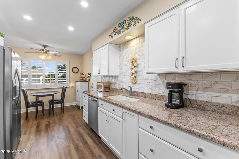 Listing details for 10410 Floriade Dr, Sun City, AZ 85351 : Expanded Coconino floor plan with Extensive Updates! This beautifully updated 2-bedroom, 2-bath, 2-car garage home features granite countertops in the kitchen, LVP and tile flooring, dual-pane windows, updated baseboards, and remodeled primary shower and vanities. Additional upgrades include sun screens, shutters, popcorn ceiling removal, updated front door, garage door opener, fresh paint, and a fully fenced yard--plus so much more!