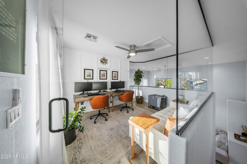 This living area features soaring ceilings—ideal for showcasing a towering Christmas tree or creating that sense of spaciousness everyone craves. Overlooking this space is a custom glassed-in office, that floods with natural light and feels like your own private eagle's nest, perfect for working from home or keeping an eye on family activities below.