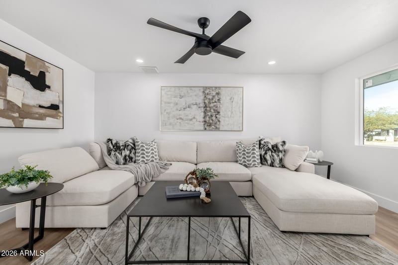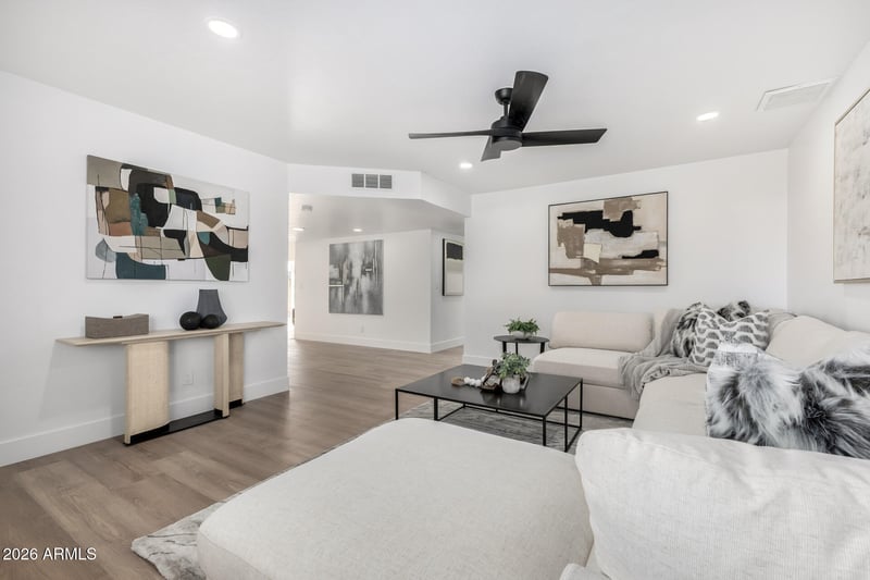 Listing details for 10425 Calle De Edens --, Phoenix, AZ 85037 : Fully renovated 3-bedroom, 2-bath home with a rare grass backyard. This move-in-ready property features an open layout, wide plank wood-look flooring, recessed lighting, and a bright modern design. The updated kitchen offers white shaker cabinets, quartz countertops, stainless steel appliances, a large island with seating, and a beverage/wine fridge area. Both bathrooms have been remodeled with modern finishes and designer tile. Bedrooms are spacious with ceiling fans and neutral tones. The backyard includes lush grass, block fencing, a covered patio/pergola, and a storage shed—ideal for entertaining, pets, or future upgrades. Indoor laundry, two-car garage, and convenient access to schools, shopping, dining, and freeways. *Furniture does not convey.*