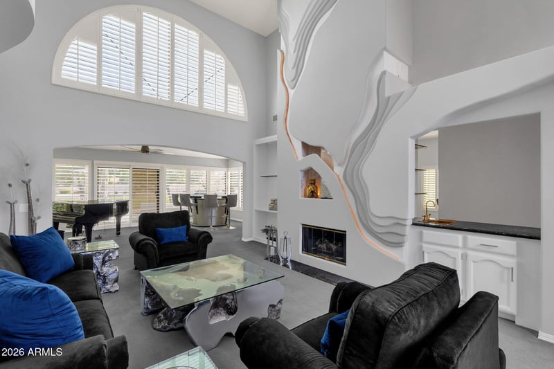 Listing details for 10429 Cedar Waxwing Ct, Sun Lakes, AZ 85248 : Experience one of the most unique homes in all of Sun Lakes! Only 4 built! El Dorado Extended floor plan; 3,400 SQFT, contemporary home; clean lines, open spaces,& an abundance of natural light throughout. Anchoring it all is the sleek gas fireplace. A dramatic floor-to-ceiling feature wall showcases flowing lines that mimic the movement of oil through rock. Set within the design is a niche displaying a gold oil drill bit; all brought to life with warm, ambient backlighting creating a striking glow! Designed to impress, the home features expansive living areas perfect for entertaining, while large windows frame peaceful views of the lake just beyond your backyard. Enjoy all of the active adult (40+) IronOaks community offers; pickleball, golf, tennis, pools & spas, clubhouse, fitness, etc.