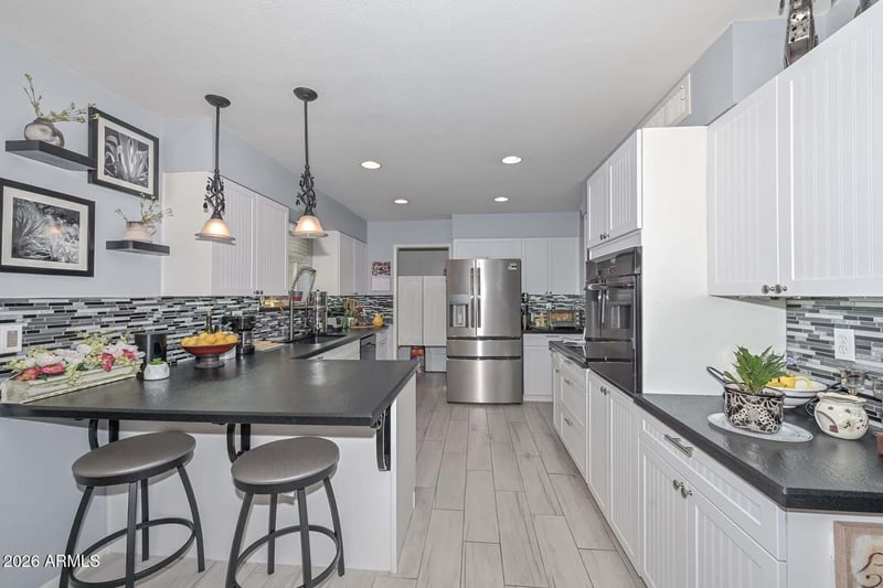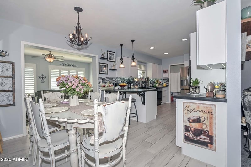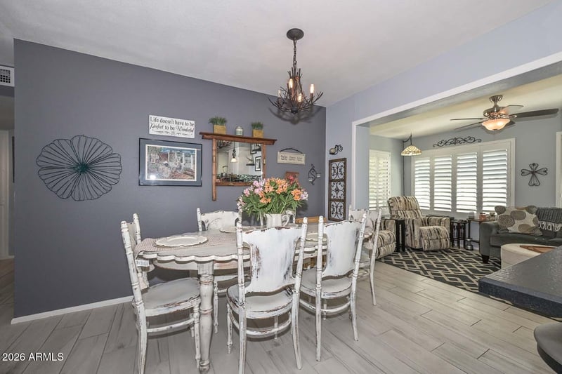 Listing details for 10502 Roundelay Cir, Sun, AZ 85351 : Beautifully Remodeled Sun City Gemini/Twin Home. This move-in ready 2-bedroom, 2-bath home blends modern upgrades with the easy, low-maintenance lifestyle Sun City is famous for. Enjoy Anderson windows, plantation shutters, fresh custom paint, smooth ceilings (no popcorn), and updated flooring throughout. The stunning kitchen features quartz countertops, a farmhouse sink, updated appliances, and convenient pull-out pantry shelving. Both bathrooms have been tastefully remodeled with elegant custom vanities. Major system upgrades include a new HVAC, tankless water heater, and electrical improvements, giving peace of mind along with style. A rare opportunity to own a highly upgraded home in one of Arizona's most sought-after active adult communities.
