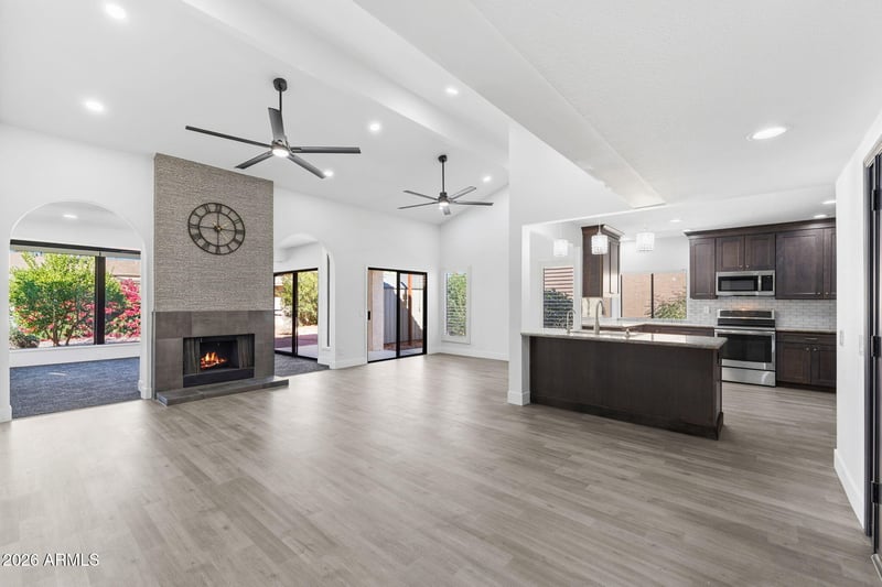 The upgraded kitchen shines with granite countertops, stainless steel appliances, subway tile backsplash, and a cozy eat-in dining area. The home features LVP flooring, vaulted ceilings, plantation shutters, and a fireplace, creating a warm yet open and airy atmosphere. The laundry room includes washer and dryer hookups for added convenience. One of the standout spaces is the Arizona room, complete with large windows, sliding doors, its own AC unit, and carpet, making it an ideal year-round living or entertaining space. The primary suite offers a double vanity and a walk-in closet, providing both comfort and functionality.