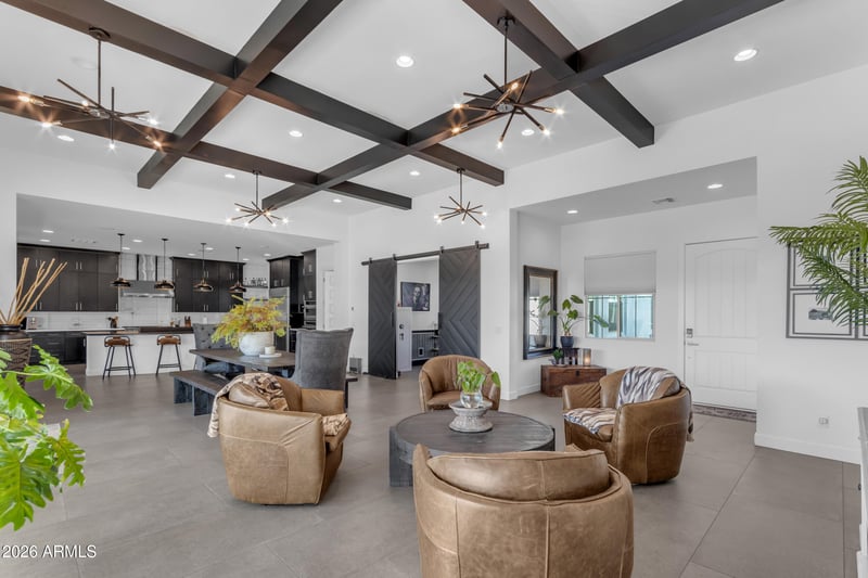 Listing details for 10545 Thorite Ave, Mesa, AZ 85212 : Welcome to an entertainer's dream where architectural intention meets everyday livability. Soaring 12-foot coffered ceilings crown both the great room and formal dining, while a dramatic 20-foot sliding glass wall dissolves the boundary between indoors and out, creating a seamless indoor-outdoor flow designed for gatherings that linger long past sunset. Throughout the home, 10-foot ceilings and curated, design-forward finishes elevate every space. The living area is grounded in large-format concrete-look porcelain tile, creating a sleek, architectural foundation, while thoughtful details like faux wood beam accents layer in warmth and dimension--balancing the home's modern aesthetic. Two expansive living spaces offer the flexibility to host with intention or unwind in a more relaxed setting.