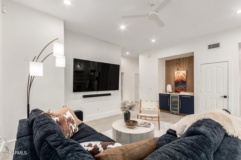 Listing details for 10579 Salt Bush Dr, Scottsdale, AZ 85255 : Beautifully updated residence in sought-after McDowell Mountain Ranch, offering refined finishes and thoughtful upgrades throughout. The home features brand-new wide plank tile flooring throughout, recessed lighting, and classic plantation shutters, creating a bright and cohesive living space. The open great room is designed for effortless entertaining and showcases a brand-new custom mini bar with high-end cabinetry and built-in wine cooler. The kitchen is both stylish and functional with stainless steel appliances, white cabinetry, quartz countertops, tile backsplash, center island with breakfast bar, and a new pull-out microwave custom-fitted into cabinetry. Behind double doors, the primary retreat features a fully remodeled ensuite bathroom with dual sinks, an oversized walk-in shower, and a spacious walk-in closet. A dedicated den offers flexibility for a home office or study, while the laundry room is enhanced with custom high-end cabinetry. Additional recent upgrades include a new water heater, water softener in the garage, garabge disposal, and a brand-new pool pump and filter, providing peace of mind and move-in readiness. Completing the property is a 3-car garage and a private backyard with a pool and hot tub, ideal for enjoying Arizona living.