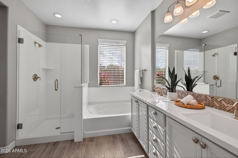 Listing details for 10603 Wavelength Ave, Mesa, AZ 85212 : This beautifully maintained single story home offers 2,154 square feet with 4 bedrooms, 3 bathrooms, a den, and a 2 car garage. The open great room design is filled with natural light and features a stunning 12 foot multi slide door that opens to the patio, creating an easy indoor outdoor connection. Upgraded finishes flow throughout the home including satin nickel hardware, 6x24 tile flooring, upgraded carpet and pad, and shutters in every room. The kitchen is both stylish and functional with 42 inch white cabinetry, granite countertops, a tile backsplash, a gas stove and oven, and elegant pendant lighting, all overlooking the main living space. The living room showcases a beautiful shiplap feature wall, complemented by additional feature walls in the entry and dining area, adding warmth and character throughout the home. A custom wood barn door leads into the den, making it a perfect space for a home office, flex room, or playroom. The primary bedroom is ideally sized and filled with natural light, highlighted by a shiplap feature wall for added charm. The ensuite bathroom offers dual sinks, abundant storage with extra drawers between the vanities, a separate tub and shower, and a spacious walk-in closet. Out back, enjoy a covered patio and lush green grass, creating a relaxing and inviting space for everyday living or entertaining. Additional features include a gas water heater, garage service door, paver driveway, entry and sidewalk, front desert landscaping, and a separate whole home generator electrical hookup already installed in the backyard. Living in Eastmark means enjoying a true resort style lifestyle with access to luxurious pools, splash pads, numerous parks, Steadfast Farm, and the state of the art clubhouse, The Mark, which hosts year round events and activities. This is an exceptional opportunity to own a thoughtfully upgraded home in one of the East Valley's most sought after communities.