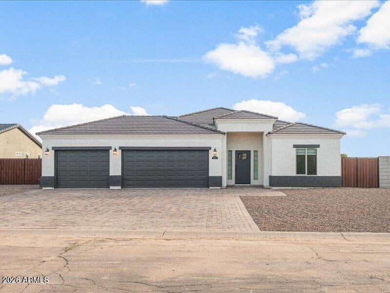 Listing details for 10731 Cove Dr, Arizona City, AZ 85123 : 3 CAR GARAGE! NO HOA, Ready 6/25/2026. Spacious entryway opens to 1648sq. ft. of pure elegance w/open floor plan and great room. Granite countertops throughout with two pantries in the kitchen and stainless steel appliances. Refrigerator included, with dishwasher and built-in microwave, granite counters plus huge breakfast bar. Ceramic tile flooring (except bedrooms that have high-end carpeting) Home has 9 ft. ceilings. Extra classy tile showers with shower doors plus walk-in master closet. Pendant lighting over kitchen island with recessed lighting in kitchen and living room, ceiling fans, and two-tone paint throughout. Double vanity in Master bath. Notice the block fencing, tile roof, oversized 3-,car garage12 ft Gate Photos are similar, but are not the home