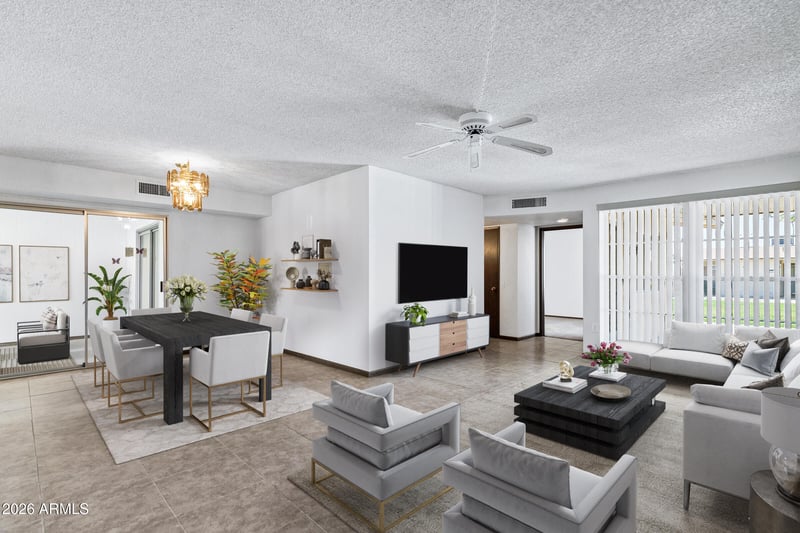 Listing details for 10737 Santa Fe Dr, Sun City, AZ 85351 : Beautifully upgraded 2-bedroom, 2-bath end-unit offering privacy, charm, and exceptional indoor-outdoor living. Both bedrooms feature spacious walk-in closets. Enjoy the rare, oversized outdoor space--perfect for entertaining or relaxing--plus a bright, enclosed Arizona room with access from the primary suite and dining area. Stylish tile flooring in main areas, plush carpet in bedrooms, and fresh paint throughout. Includes a spacious garage with built-in storage, newer AC, and new garage opener. HOA covers major expenses for true low-maintenance living. Pet-friendly community. Move-in ready gem!