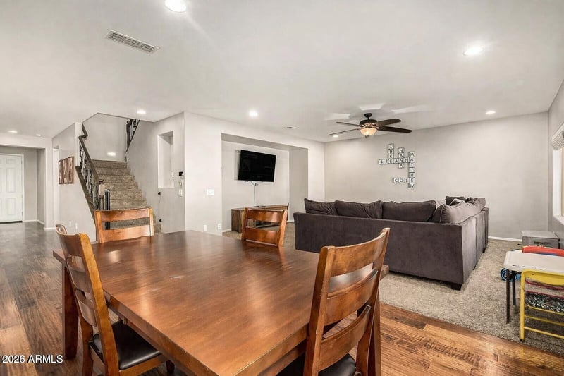 Listing details for 10752 Desert Elm Ln, Peoria, AZ 85383 : Spacious & thoughtfully designed 5-bdr home featuring a huge extended garage. A full bedroom & bath on the main level offer flexibility for guests or multigenerational living. Enjoy hardwood flooring in the entry, kitchen and dining areas, along w/ recessed lighting & ceiling fans throughout. The chef's kitchen impresses w/ granite counters, a large center island, gas cooktop. Upstairs inc. 4 additional bedrooms, a generous loft,& a luxurious owner's suite w/a walk-in closet, dual-vanity, soaking garden tub sep. shower. Added conveniences include a central vacuum system, large upstirs storage area with shelving, & large laundry rm w/ cabinetry & utility sink. Step outside to a grassy backyard with paver covered patio & side walkway, perfect for relaxing or entertaining. Hiking & walk ing trails. this home offers space, comfort and functionality throughout.