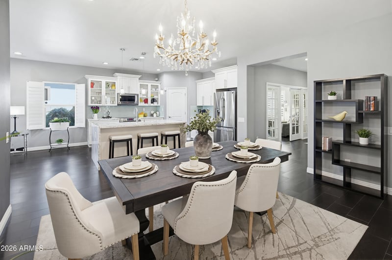Listing details for 10772 Yearling Rd, Peoria, AZ 85383 : Located in beautiful Tierra del Rio in North Peoria, this fully remodeled home blends modern style with everyday comfort in a bright, open layout. Gorgeous dark wood plank tile flooring runs throughout the home, setting a warm and sophisticated tone the moment you step inside. The redesigned kitchen is a true showpiece, featuring white staggered cabinets with glass doors, pull-out drawers, a stunning waterfall-edge granite island, farmhouse sink, stainless steel appliances, and a spacious walk-in pantry. An elegant dining area sits perfectly between the kitchen and living space, enhanced by recessed lighting and abundant natural light, while wood shutters throughout the home add timeless character. The kitchen flows seamlessly into the living area, creating an ideal space for entertaining or relaxing. Sizable guest bedrooms provide flexibility, with the first guest room featuring double doors that allow it to function as a bedroom or a separate living space. A stylish den offers the perfect setting for an office, media room, or exercise studio. The remodeled guest bathroom showcases designer tile flooring and a dual sink vanity, while the spacious primary suite delivers a private retreat with a beautifully updated bathroom and dual sinks. Step outside to a backyard designed for gatherings, complete with a covered patio, an expansive paver area that extends deep into the yard, and a lush grass area framed by mature landscaping. Ideally located near shopping, restaurants, and the highly desirable Four Corners area of Peoria, this move-in-ready home offers style, function, and an unbeatable location.