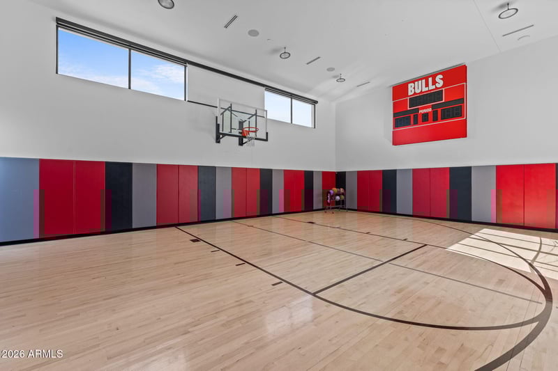 Indoors, an expansive multi-sport court with premium hardwood flooring adapts effortlessly to basketball, volleyball, pickleball, or other activities, providing year-round training space regardless of Arizona's weather. Complementing this is a professional-grade workout gym boasting mirrored walls for form checking, specialized rubberized flooring to protect joints during heavy lifting, and ample space for free weights, cardio machines, and functional training setups.