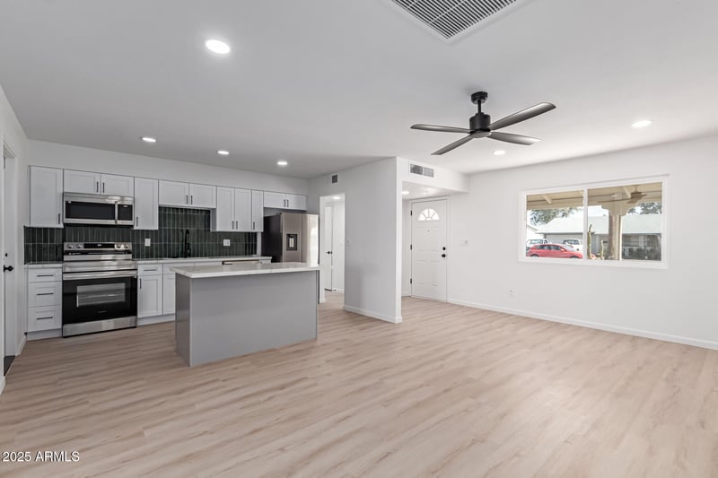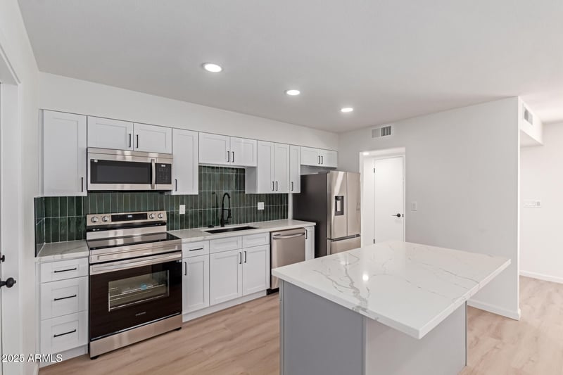 The stylish kitchen is equipped with quartz countertops, stainless steel appliances, ample cabinetry, and a convenient breakfast bar. The spacious primary suite includes a walk-in closet and private en-suite bath.
