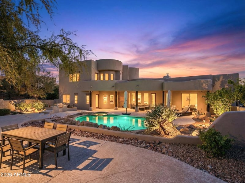 Listing details for 10918 Sutherland Way, Scottsdale, AZ 85262 : Located in the guard-gated community of Candlewood Estates in Troon North, this timeless territorial-style home has been thoughtfully updated. Set on a private corner lot with no home behind the property takes advantage of the beautiful desert surroundings. Inside, the home showcases a stunning new kitchen featuring a massive 62'' refrigerator/freezer, gas cooktop, double ovens, custom cabinetry, and a built-in bar area. Wide-plank wood flooring flows throughout the main living spaces, complementing the warm, inviting design. Oversized primary suite occupies the upper level, offering views of Pinnacle Peak and access to a private walk-out deck. Three additional guest suites, each with its own private bath, are located downstairs. With four fireplaces, the home exudes comfort and charm. The private backyard is perfect for entertaining, featuring a heated pool and spa, a built-in gas BBQ, and an outdoor fireplace. Meticulously maintained, the home includes new A/C units, a new roof, and a spacious three-car garage with an epoxy floor.