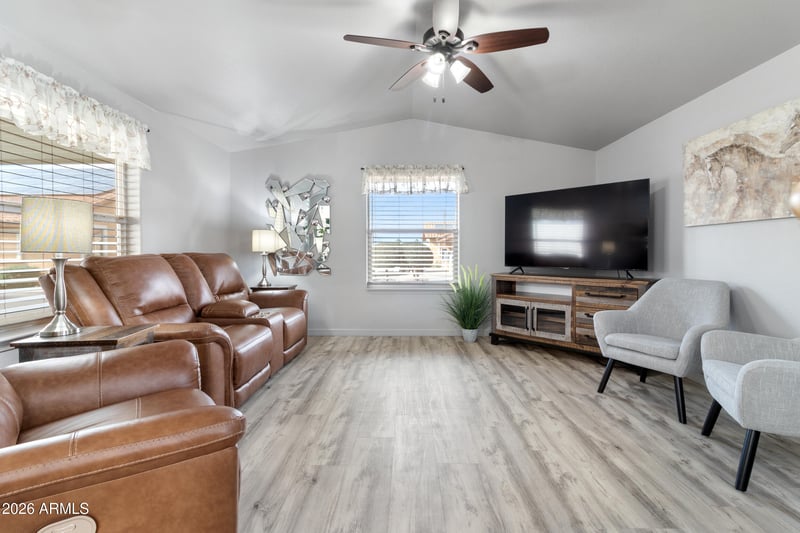 Listing details for 10936 Apache Trl #121, Apache Junction, AZ 85120 : Beautifully fully remodeled home in the desirable Lost Dutchman 55+ community, ideally situated on a prime interior lot just steps from the pool and clubhouse. This home features a fresh, modern feel with new interior and exterior paint, brand-new flooring, high vaulted ceilings, smooth drywall, recessed lighting, and custom finishes throughout.