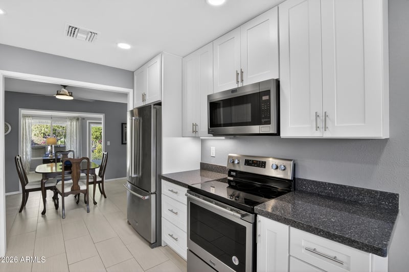 Listing details for 10939 Roundelay Cir, Sun City, AZ 85351 : Welcome to this upgraded - well-kept home in Sun City with great curb appeal, a covered front patio, and a low-maintenance lot with mature citrus trees. Inside, the kitchen stands out with white cabinetry, granite counters, newer stainless steel appliances, and a clean updated look that opens nicely to the dining area and main living space. The layout offers multiple areas to spread out, including a bright bonus Arizona room living space with large windows and backyard access. The primary suite is spacious, and the home also features updated baths, a large indoor laundry/storage room, and plenty of room for everyday living. Out back you have a covered patio, generous yard space, and the easy Arizona lifestyle Sun City is known for with golf, rec centers, clubs, pools, and more.