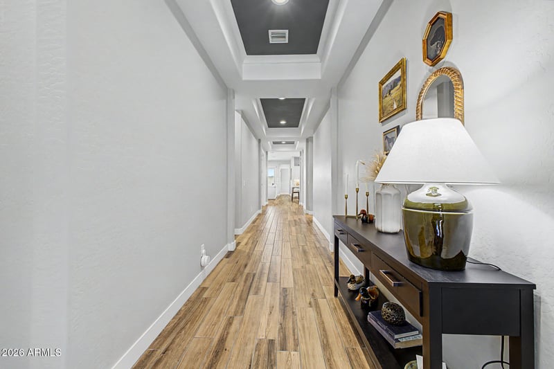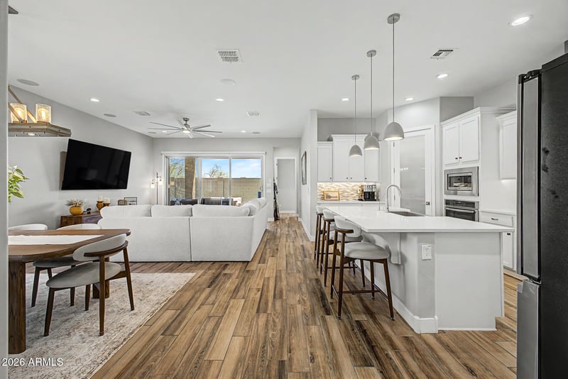 Listing details for 10949 183rd Dr, Surprise, AZ 85388 : Modern comfort meets throughtful design in this stunning, 4-bedroom, 3 full bath, plus flex space home offering elegant finishes and customized elements in the details! Inside enjoy an abundance of natural light, durable tile wood-look flooring, new window coverings and whole home filtration system. The kitchen is a Chef's delight with wall oven, stylish tile backsplash, quartz countertops, crisp white cabinets, pantry and an oversized island! The primary suite provides a private, relaxing retreat with a soaking tub, separate shower, dual vanity and walk-in closet. The flex space works perfectly as an office or playroom. Enjoy your oversized lot, privacy, easy care turf, mature landscaping, covered patio and great curb appeal! Plus a 2.5-car garage with workbench, ample storage and AC!