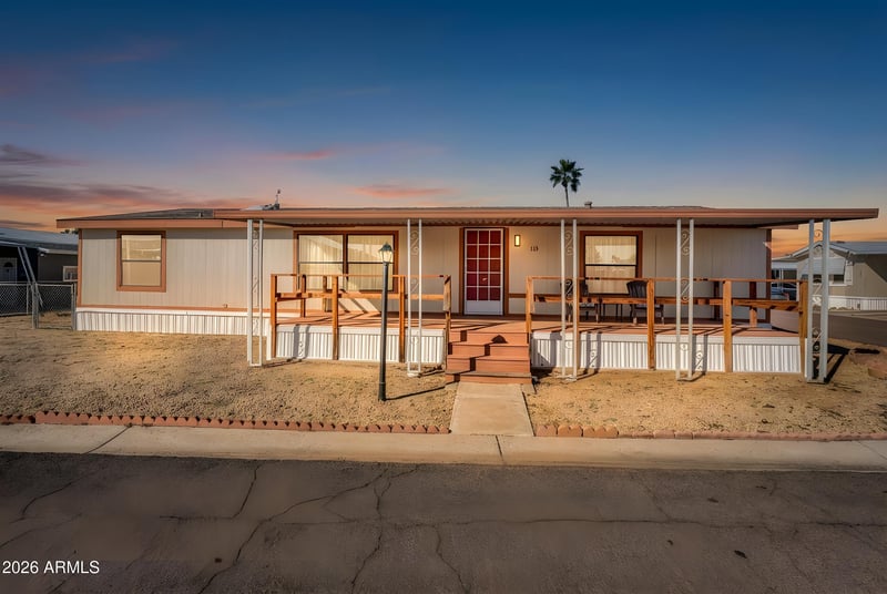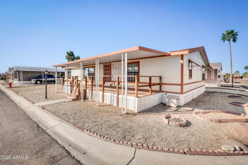 Listing details for 10955 79th Ave #113, Peoria, AZ 85345 : Move-in ready and thoughtfully positioned at the end of the street, this home offers added privacy with no neighbor on one side. Light and bright open kitchen features an eat-in dining area, beautiful cabinetry, pull-out shelving, and excellent functional space. Includes a brand new washer, dryer, and refrigerator, along with a separate laundry room located off the kitchen. The spacious master includes a comfortable en suite bathroom, walk in shower and large closet. Newer AC/heater. Enjoy outdoor living from the front porch sitting area, plus the convenience of a covered carport, storage shed, and a fenced yard ideal for pets. Community amenities include a pool, clubhouse with TV lounge, full kitchen, game & billiards room, exercise room, cornhole area, twin gazebos, BBQ grill, and 4 New doggie stations with benches! The community requires park approval. There is a $50 non-refundable Application Fee for each applicant over the age of 18 wishing to apply to the park. Pets: One (1) medium size dog not to exceed thirty-five (35) pounds and sixteen (16) inches high at the shoulder when full grown is allowed per home. In the alternative, two (2) dogs and/or house cats are allowed. Dogs may not exceed fifteen (15) pounds and twelve (12) inches height at the shoulder when full grown. Details may be found in the Rules and Regulations of the Park. There is a thirty-five dollar ($35.00) monthly charge for each pet. Larger pets are not permitted. Pet fees do not apply to service animals.