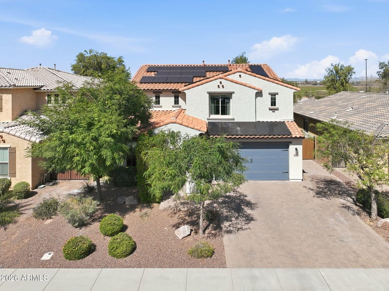 Listing details for 1096 Flamingo Way, Gilbert, AZ 85297 : Professionally remodeled kitchen with quartz countertops, rich maple cabinetry, and accent lighting. Plank tile throughout. Main level includes a private den with doors near the half bath. Walk-in closets in every bedroom. Upstairs, an oversized secondary bedroom (18'5'' x 12') works as a guest suite or for kids sharing a room. Spacious loft for flexible living. Backyard features pebble-finish saltwater pool, paver patio, and above-ground hot tub. Whole-house soft water and reverse osmosis. Fully owned 12.9 kW solar with 25-year warranty -- saves of $200-$300/mo in summer! New roof (2024), updated baths (2025), exterior repaint (2024). 3-car tandem garage + widened driveway + RV gate. Fiber optic available. One mile to the 202, 4 miles to San Tan Village Mall. PROPERTY OVERVIEW