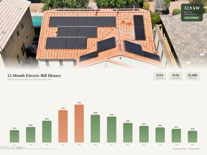 Fully owned 12.9 kW rooftop solar system installed by Elevation Solar (SRP-certified). The system includes 36 Panasonic panels with SolarEdge inverters, all covered by extended 25-year warranties. Estimated savings of approximately 200-300/month in summer and 50-100/month in winter. Additional features include a demand controller to minimize SRP peak demand charges and circuit-level monitoring for real-time energy tracking.
