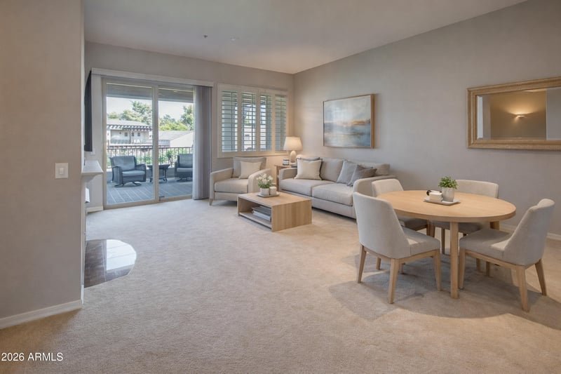 Listing details for 11000 77th Pl #2017, Scottsdale, AZ 85260 : Resort-Style Living in the Heart of Scottsdale. Experience the best of Scottsdale in this beautifully maintained 2BD, 2BA condo with 1,463 sq ft of comfort and style. Enjoy stunning Starfire Golf Course views from the spacious East-facing covered balcony. The open layout features a large living room with a cozy gas fireplace, dedicated dining area, and a well-appointed kitchen with raised maple cabinetry, pantry, and breakfast bar. The expansive primary suite offers direct patio access, large walk-in closet and dual sinks. Located in a gated community with resort-style amenities including a fitness center, heated pool, and spa. Perfect for a year-round residence, winter getaway, or investment. Close to top restaurants, shopping, grocery stores, and the Loop 101.