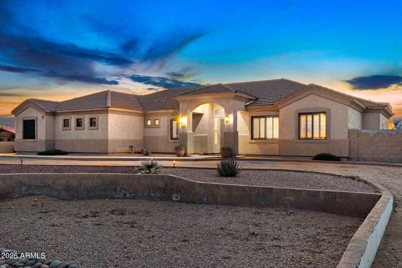 Listing details for 1104 Mountain Rd, Mesa, AZ 85207 : Step onto this expansive 55,000+ sq ft estate, a rare find offering unmatched freedom with no HOA, horse friendly zoning, and endless room for every vehicle, toy, and dream you own. This property delivers the space, privacy, and versatility that simply can't be replicated. The backyard is an entertainer's paradise, featuring an extended covered patio overlooking a heated pool and spa with a stunning water feature AND A SLIDE, perfect for year‑round enjoyment. A massive 3‑car garage with extended-height doors and an oversized driveway ensures effortless parking for RVs, trailers, and more. Inside, the custom 4 bed/2 1/2 bath home welcomes you with a warm, inviting atmosphere and thoughtful upgrades throughout plus a large chefs kitchen. Leased solar ensures electricity sav