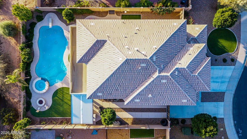Listing details for 11049 Thatcher Ave, Mesa, AZ 85212 : Start creating unforgettable memories in this stunning and highly upgraded two-story home with breathtaking sunset views! From the moment you arrive, you'll appreciate the 3-car garage, RV gate with Driveway, and the inviting curb appeal. Inside, charming archways, soaring ceilings, and tile floors in all the right places. Custom Office with Alder wood cabinets and book cases with sconces. Gather for entertaining and cooking in the beautifully appointed kitchen, featuring gas cooktop, stainless steel wall ovens, rich wood cabinetry, granite countertops, a stylish tile backsplash, a center island with a breakfast bar, and a walk-in pantry and the butlers pantry is great for hosting in the dining room. Large Great Room has custom cabinets and soaring ceilings with lots of natural light. The primary suite is a peaceful haven with a chic bathroom offering dual vanities, a relaxing soaking tub.and a generous walk-in closet. A spacious loft is perfect for movie nights or casual hangouts, Step outside to your private backyard oasis complete with a covered patio, built-in BBQ, cozy firepit, rejuvenating spa, and a sparkling pool perfect for relaxing or entertaining year-round. This is more than a home; it's where life happens. Come and experience its allure for yourself!