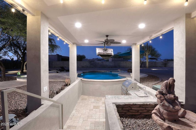 Listing details for 1105 110th St, Mesa, AZ 85207 : Summer-ready REMODELED 3465 sf home tucked away on 1.3+ acre cul-de-sac lot w/room for workshop, RV garage, and more. SELLER WILL CONSIDER CONCESSIONS WITH THE RIGHT OFFER. This split flexible floorplan has pleasing neutral color palette: LVP wood floors throughout, updated kitchen w/tile backsplash, cabinets and hardware, quartzsite counters, breakfast bar and island, stainless appliances, and huge picture window overlooking resort-pool setting and Superstition mountains. New bathroom showers, tile, hardware, faucets, vanities, lighting, soft close toilets. Primary suite w/backyard exit, and bedroom sitting area (or ideal baby nursery). Nice-sized secondary bedrooms. Split NextGen wing ideal for guests, extra space for entertaining, home-based business, or rental income: includes great room w/backyard exit, bedroom and bathroom, kitchenette w/breakfast bar plus bonus room w/separate exit. Heated Pebble Radiance pool & spa w/smart system, travertine patios & walkways, new gazebo w/swim up bar, built-in gas bbq, TV mount, and refrigerator. Side yard watering system for garden use. Superstition Views! No HOA. Pre-listing home inspections done. In-ground termite control system transferable. Close to lakes. SEE FLOORPLAN in photos.