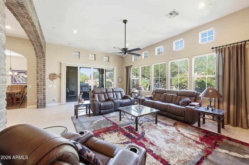 The family room is filled with natural light from a multitude of windows, including picture and clerestory windows with grid patterns for architectural detail. A built-in entertainment niche and stone/brick accent wall complement the open layout, which flows seamlessly to the backyard.