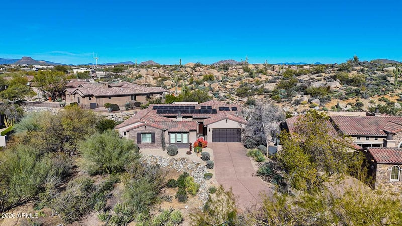The home offers 3 bedrooms, 2.5 baths, 2,947 square feet, and a 3-car garage, with recent enhancements including customized closets, new power shades in the family room, and an owned solar system for added efficiency. Outdoor living spaces are exceptional. A long extended driveway creates a generous setback, with natural area open space to one side for added privacy. The front courtyard features a fireplace, travertine hardscape, gated entry, and direct access to the single-bay garage. The backyard includes a covered paver patio, natural gas BBQ, artificial turf, mature landscaping, and backs directly to dramatic boulder outcroppings, creating a truly private desert setting.