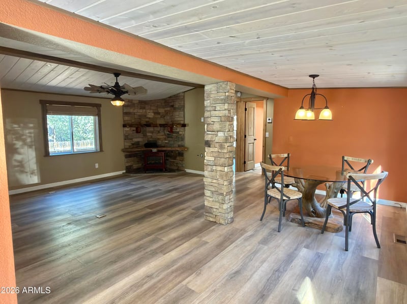 Listing details for 1106 William Tell Cir, Payson, AZ 85541 : This beautifully maintained 2-bedroom + den retreat offers the perfect blend of mountain charm and modern comfort. Tucked away in a hillside neighborhood, the property features a large yard shaded by mature pines--ideal for enjoying crisp mountain air from your covered porch. Inside, you'll find tasteful finishes, a cozy kitchen, and a turnkey setup. Whether you're looking for a peaceful primary residence or a fully furnished, high-potential Airbnb, this home is ready for its next chapter.