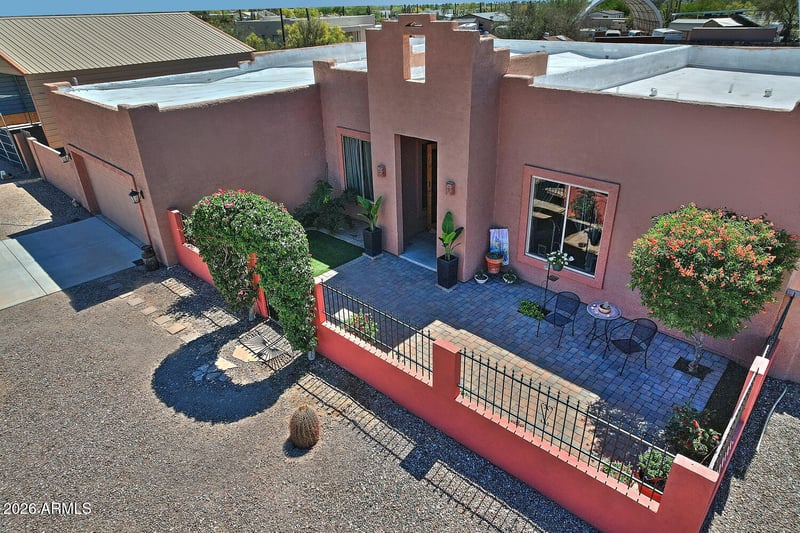 Listing details for 1111 Superstition Blvd, Apache Junction, AZ 85119 : Beautiful Santa Fe-style home on 1.25 acres with stunning Superstition and Dome/Pass Mountain views. Located directly across from BLM land, this property offers privacy, open space, and immediate access to desert trails. Outdoor amenities include a 10,000-gallon pool with sail shade, landscaped courtyard, covered patio, and 16x4 raised garden bed with bird netting. The property is fully fenced with block wall and no-climb fencing with multiple gates. Additional features include a 35x36 RV/vehicle shade structure, two tool/work sheds, detached 14x10 bonus room, tack shed with three covered pens, hay shed, round pen, and ample extra parking. No HOA and ample room for horses, recreational vehicles, gardening, or hobbies, this property offers flexibility and functionality.