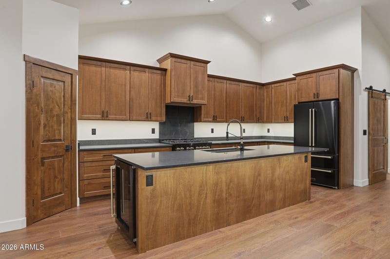Listing details for 1112 Kinzer Ct, Payson, AZ 85541 : Welcome to Green Valley Vista, where exceptional craftsmanship meets quiet mountain living. Brand-new 2,193 sq ft single-level home offers a thoughtfully designed split floorplan and was custom built by the builder for himself — meaning every finish was selected with intention and no detail was overlooked. At the heart of the home is a stunning chef's kitchen featuring an upgraded ZLINE appliance package, highlighted by a professional 6-burnergas range, oversized island with integrated beverage/wine cooler, granite countertops, and beautifully upgraded cabinetry. A unique feature is the expansive kitchen view window, designed to double as a pass-through to the patio creating seamless indoor-outdoor entertaining while perfectly framing views of North Peak in the Mazatzal Mountain Range. Step outside to the impressive 600 sq ft covered patio, offering generous space for dining, lounging, and entertaining while taking in the natural beauty of Rim Country and the stunning North Peak backdrop. Premium upgrades continue throughout, including Pella windows, upgraded flooring, designer cabinetry, and elevated finishes. The striking metal front and primary suite doors by Cherry Forge, complete with built