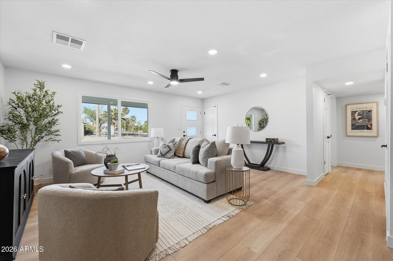 Listing details for 1113 Marigold Ln, Tempe, AZ 85288 : Beautifully renovated home now for sale, featuring a fresh, modern design throughout. This move-in-ready property offers a completely updated kitchen with sleek black quartz countertops, new appliances, and a built-in wine cellar, along with fully remodeled bathrooms, new flooring, and fresh interior paint. Enjoy seamless indoor-outdoor living with an accordion-style patio door that opens to a private backyard framed by mature ficus trees, creating a peaceful and secluded setting. New landscaping enhances curb appeal, while the home's prime location provides close proximity to major shopping, dining, and everyday conveniences. A perfect blend of style, comfort, and location.