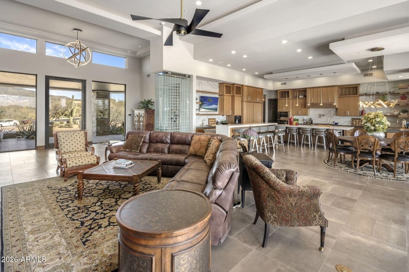 Listing details for 11171 Painted Sky Cir, Scottsdale, AZ 85262 : FULL GOLF MEMBERSHIP TRANSFERS. This modern Desert Mountain home in the Village of Painted Sky offers effortless single-level indoor-outdoor living, a spacious great room, and a well-executed split floor plan. Designed with elegance and simplicity, the residence enjoys privacy and sweeping views of the Apache Golf Course, sunsets, city lights, and surrounding mountains. Southwest patio exposure enhances natural light and outdoor enjoyment. The primary suite and office are located on one side of the home, with three en-suite guest bedrooms and a flexible bonus room on the other—perfect for a gym, media room, or additional living space. Finishes include tile flooring throughout, quartz countertops with waterfall edges and full-height backsplashes, and rift-cut walnut cabinetry.