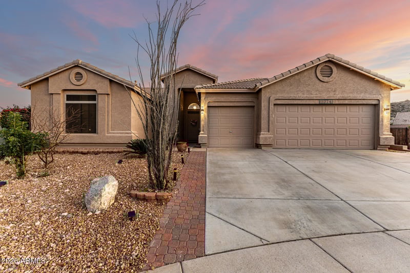 Listing details for 11224 Fiesta Ct, Goodyear, AZ 85338 : Tucked away in a quiet cul-de-sac with mountain views as your backdrop, this 4-bedroom home invites you to slow down and stay awhile. Vaulted ceilings and warm wood-look floors create an open, welcoming feel, while the heart of the home - the bright kitchen with granite counters and a generous island - is made for morning coffee and easy gatherings. Unwind in a peaceful primary suite, then step outside to your own private retreat. With a covered patio, sparkling pool, and an oversized backyard on a 13,000+ sqft lot, this is where weekends turn into staycations and evenings end under Arizona sunsets. sitting space with an easy-care landscape, and a sparkling pool to enjoy sunny days! Hurry up, this gem won't last!