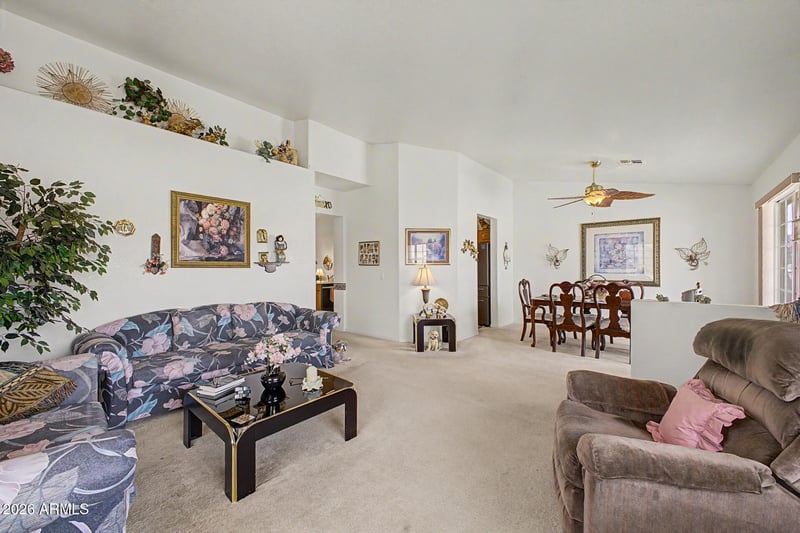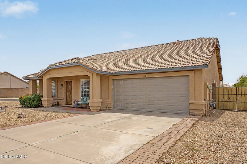 Listing details for 1123 15th Ave, Apache Junction, AZ 85120 : Discover the charm of this fantastic 3-bed, 2-bath home on a desirable corner lot! Featuring a welcoming front porch, 2-car garage, and low-maintenance landscaping. Inside, enjoy vaulted ceilings, abundant natural light, neutral tones, and a mix of carpet and tile flooring throughout. The spacious living area flows into a cozy dining space, separated by a partial knee wall for an open feel. The family room offers a warm fireplace, while the kitchen includes black stainless steel appliances, pantry, ample cabinetry, built-in desk, and a peninsula with breakfast bar. The main suite features bay window, dual sinks, and separate tub/shower. Large backyard with RV gate, covered patio, and PAID-OFF solar panels!